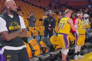 笑死!老詹靠技术台休息,旁边俩球迷拿他当背景拍照